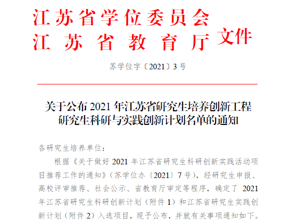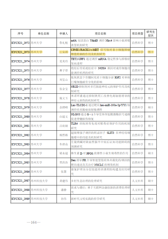根据苏学位字﹝2021﹞3号《关于公布2021年江苏省研究生培养创新工程研究生科研与实践创新计划名单的通知》,2021年江苏省研究生培养创新工程研究生科研与实践创新计划名单已公布,呼吸疾病研究所2020级研究生王安祺申报的“CPNE1/RACK1/c-MET信号轴对非小细胞肺癌增值转移的作用及机制研究“项目入选研究生科研创新计划自然科学类项目,获得1.5万元科研基金支持。