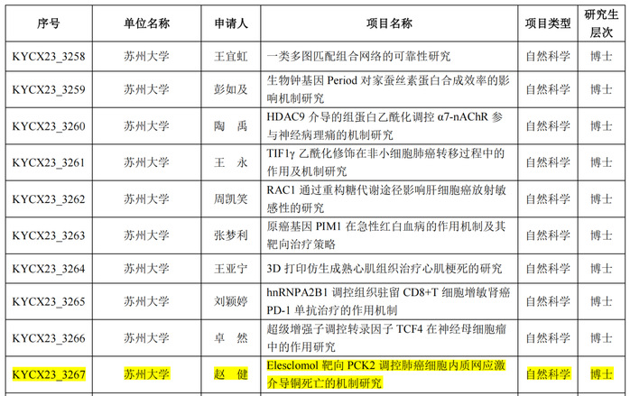苏州大学呼吸疾病研究所2022级学术型博士研究生赵健申报的“Elesclomol靶向PCK2调控肺癌细胞内质网应激介导铜死亡的机制研究”项目入选研究生科研创新计划项目(自然科学类),获得1.5万元科研基金支持。该项目的申报成功离不开前期所长黄建安教授,办公室主任刘泽毅研究员的悉心指导,同时也是研究所全体师生团结、奋进的缩影。