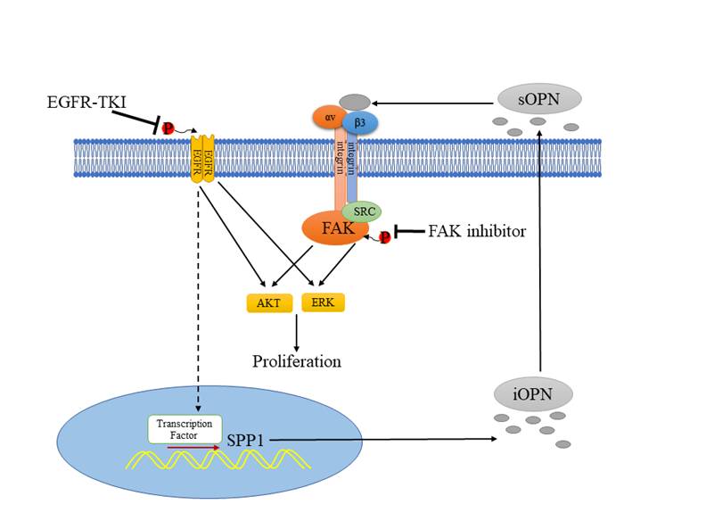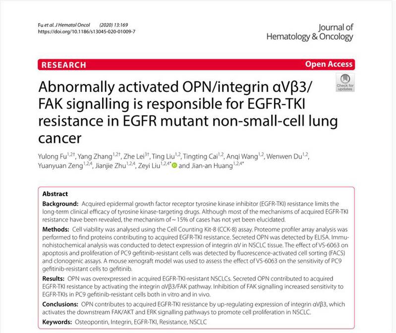 12月课题组再添新作,在Journal of Hematology & Oncology(2019年影响因子:11.06)期刊上发表题为“Abnormally activated OPN/integrin αVβ3/FAK signalling is responsible for EGFR-TKI resistance in EGFR-mutant non-small-cell lung cancer”的研究论文。发现骨桥蛋白(Osteopontin, OPN)在EGFR-TKI获得性耐药非小细胞肺癌中分泌增多,且OPN通过上调整合素αVβ3的表达,激活下游FAK/AKT和ERK信号通路,促进非小细胞肺癌细胞增殖,从而促进获得性EGFR-TKI耐药。课题组硕士研究生符宇龙,博士研究生张杨为本文并列第一作者,刘泽毅副研究员和黄建安教授为该文共同通讯作者。