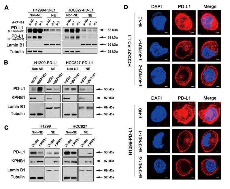 PD-L1 分子是 B7 协同刺激分子超家族的重要成员,其经典作用是可以通过受体 PD-1 传递抑制性信号使肿瘤局部微环境 T 细胞免疫效应降低,介导肿瘤免疫逃逸,促进肿瘤生长。虽然 PD-L1 分子可作为肿瘤免疫治疗的有效靶点,但有一部分病人并不能从该分子的免疫治疗中获益,5年生存率没有显著改善。后续研究揭示了该分子可以不依赖机体免疫系统,单独作为膜蛋白通过激活一系列肿瘤内源信号通路在多种肿瘤的增殖、转移、耐药、糖酵解等生物学过程中发挥着重要调控作用。PD-L1主要表达在细胞膜和细胞浆中,但在某些特殊情况下也可以进入细胞核。研究证实核PD-L1表达与肿瘤细胞耐药及病人不良预后密切相关。而最新Cell Research、Nature cell biology研究也报道核PD-L1可以转录调控下游靶基因表达并与肿瘤细胞焦亡、免疫疗效密切相关。因此研究核PD-L1分子在肿瘤发生发展中的功能及潜在机制已成为了热点和难点,但在肺癌中目前尚无任何研究报道。