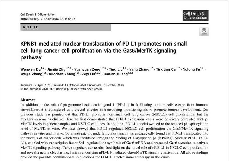 2020年11月,苏州大学附属第一医院呼吸与危重症医学科、苏州大学呼吸疾病研究所在 Cell Death &Differentiation (2019年影响因子:10.7)杂志以研究论文的形式发表了关于PD-L1分子入核通过激活Gas6/MerTK信号通路促进非小细胞肺癌细胞增殖的最新研究成果:“KPNB1-mediated nuclear translocation of PD-L1 promotes non-small cell lung cancer cell proliferation via the Gas6/MerTK signaling pathway”。 课题组博士研究生杜雯雯、朱健洁和曾园园博士为共同第一作者,刘泽毅副研究员和黄建安教授为共同通讯作者。