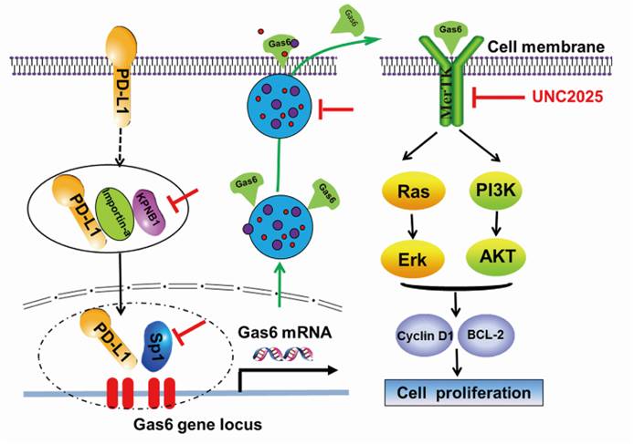 本项研究发现,在肺癌中 PD-L1 高表达,高表达的PD-L1通过与入核蛋白KPNB1相结合进入细胞核,并与转录因子Sp1协同作用促进Gas6转录。高表达的Gas6通过粘附在外泌体表面释放至细胞外,通过与细胞膜上的MerTK受体结合,活化 MerTK及其下游AKT、Erk信号通路,促进肿瘤细胞的增殖能力。本研究不但有助于阐明 PD-L1 分子的新功能,更有可能为克服部分PD-L1高表达的肺癌患者不能从PD-1/PD-L1免疫治疗中获益提供新的治疗思路。
