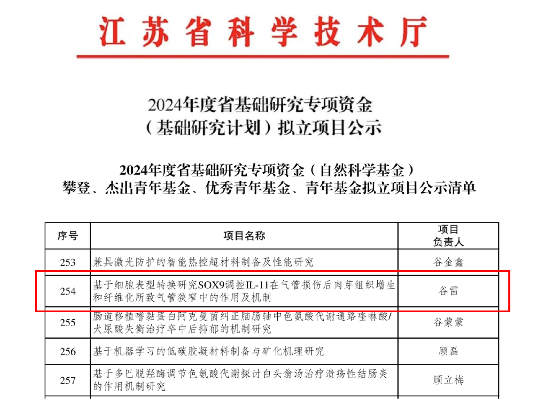 此外,2024年7月5日从江苏省科技厅网站发布的“关于2024年度江苏省自然科学基金拟资助项目的公示”获悉谷雷博士成功获得本年度省自然科学基金青年项目立项资助。